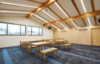 低層の住宅街に馴染むよう、2階のスタッフエリアを勾配屋根のふところを利用しながら作ることにより高さを抑えた木造としました。そして1階の食堂とフィットネス、2階の会議室は小屋組を見せるインテリアとしています。1階は建物の中央に利用者の居場所となる食堂を設け、周囲に少人数で使える小部屋を用意し、利用者がそれぞれ好みの活動ができる空間を用意しています。外部には土間につながる回廊を設け、隣地の真寿園の庭を囲い、一体の外部を楽しめるよう設えました。